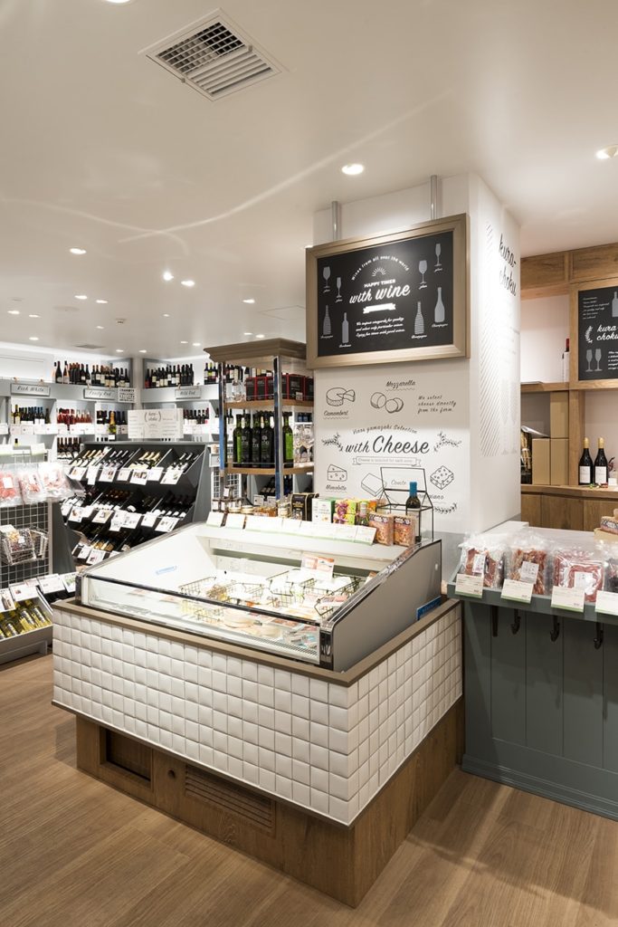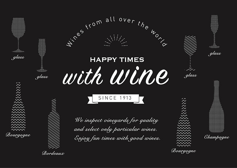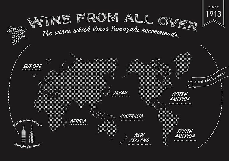 エントランスをはじめ壁面や黒板などそれぞれの場所に合わせてワインやチーズなどを